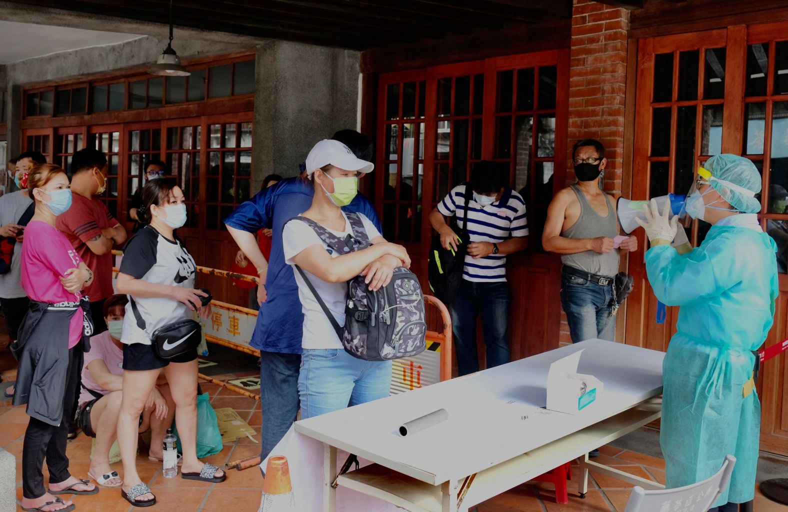 A healthcare worker speaks to local residents who queued up for Covid-19 testing at Wanhua District in Taipei, on May 19, 2021.