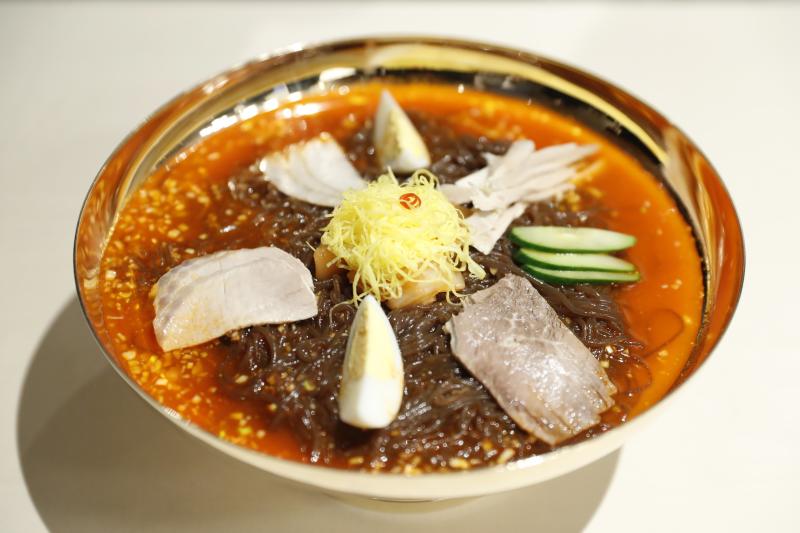 A cold noodle dish served in a cool mild broth, "Pyongyang naengmyeon" is usually garnished with pieces of meat and vegetables.