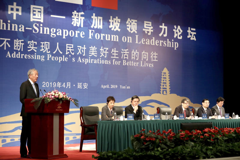 Deputy Prime Minister Teo Chee Hean delivering the opening address at the 7th Singapore-China Forum on Leadership in Yan'an on April 14, 2019. Also on the panel were (from left) Minister for Culture, Community and Youth Grace Fu, Minister for Trade and Industry Chan Chun Sing, the Chinese Communist Party's Central Committee Organisation Department Minister Chen Xi and Shaanxi party secretary Hu Heping.