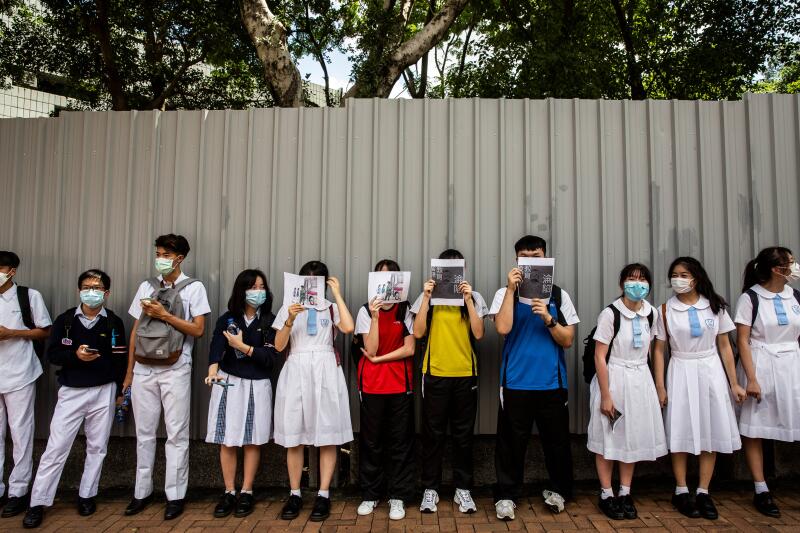 Students hold signs during a pro-democracy protests near their school in Hong Kong, on June 12, 2020.