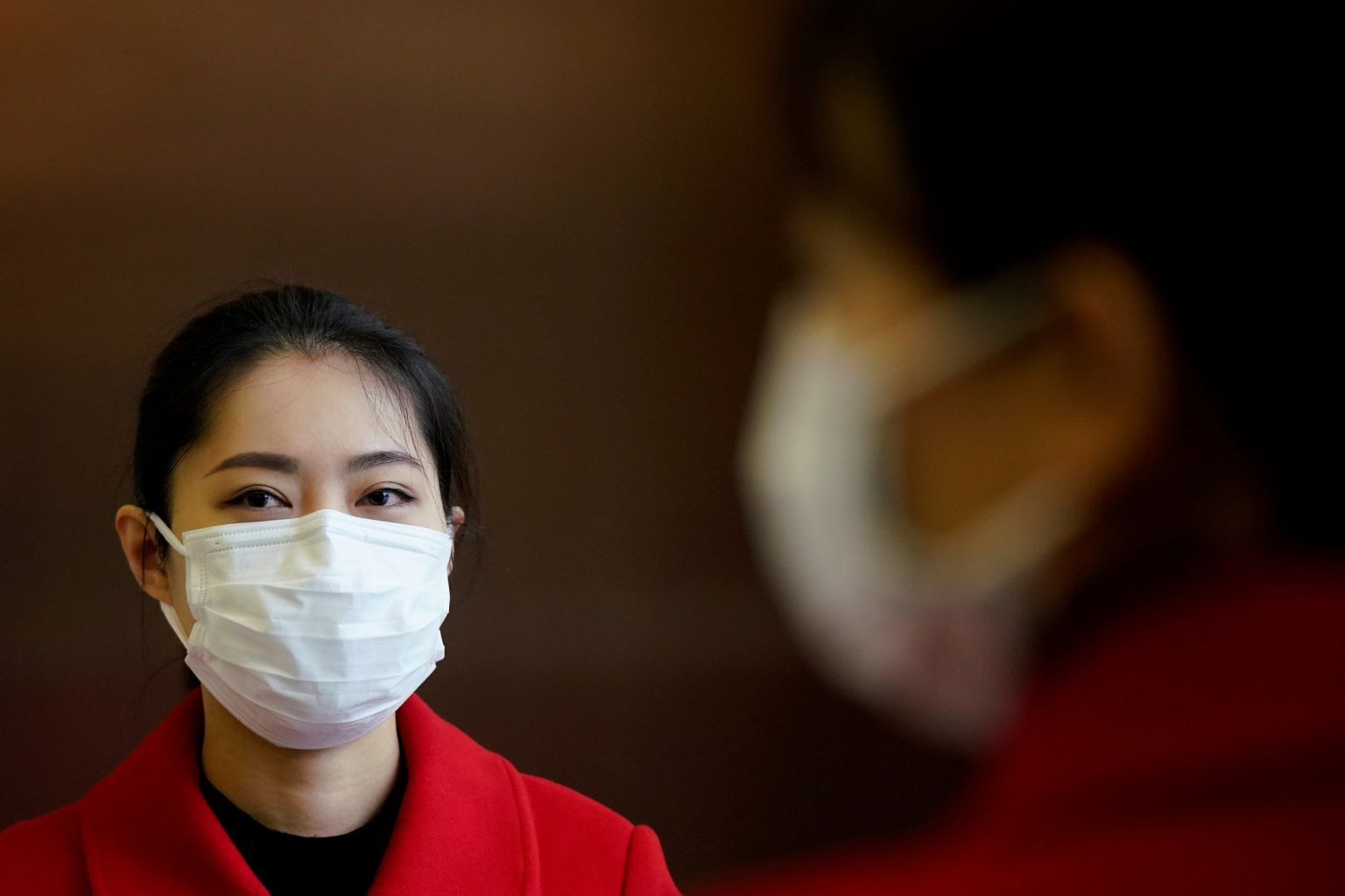 Staff members wear face masks at the entrance to a shopping mall in Wuhan, China, March 30, 2020.
