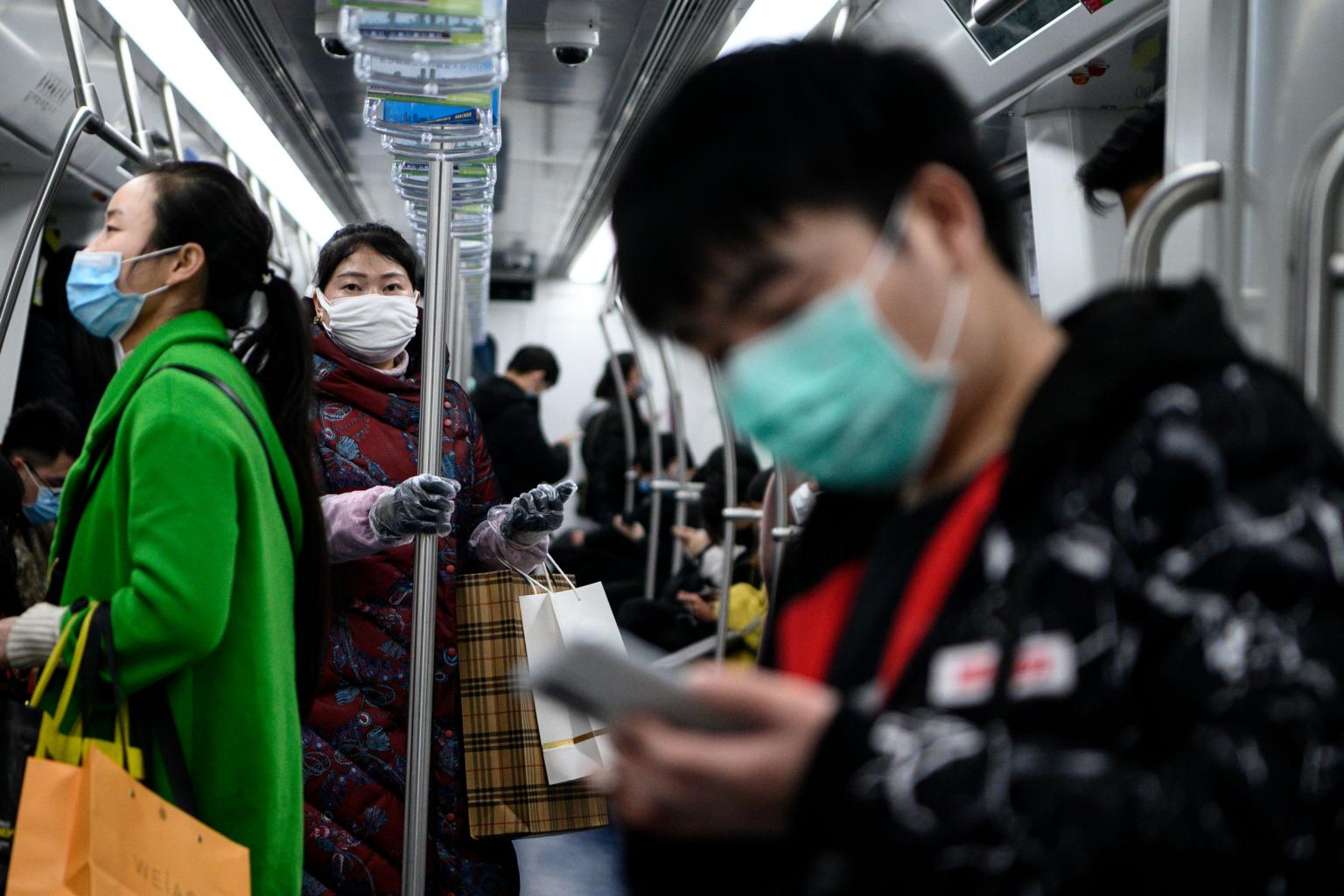 Commuters wearing face masks travel in the metro in Changsha, the capital of Hunan province, on March 5, 2020.