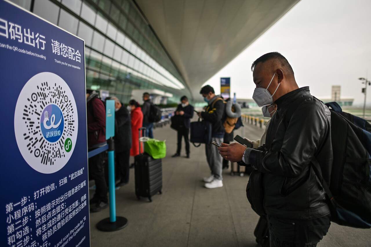 A passenger prepares to scan a Wuhan city health QR code in China on April 11, 2020.