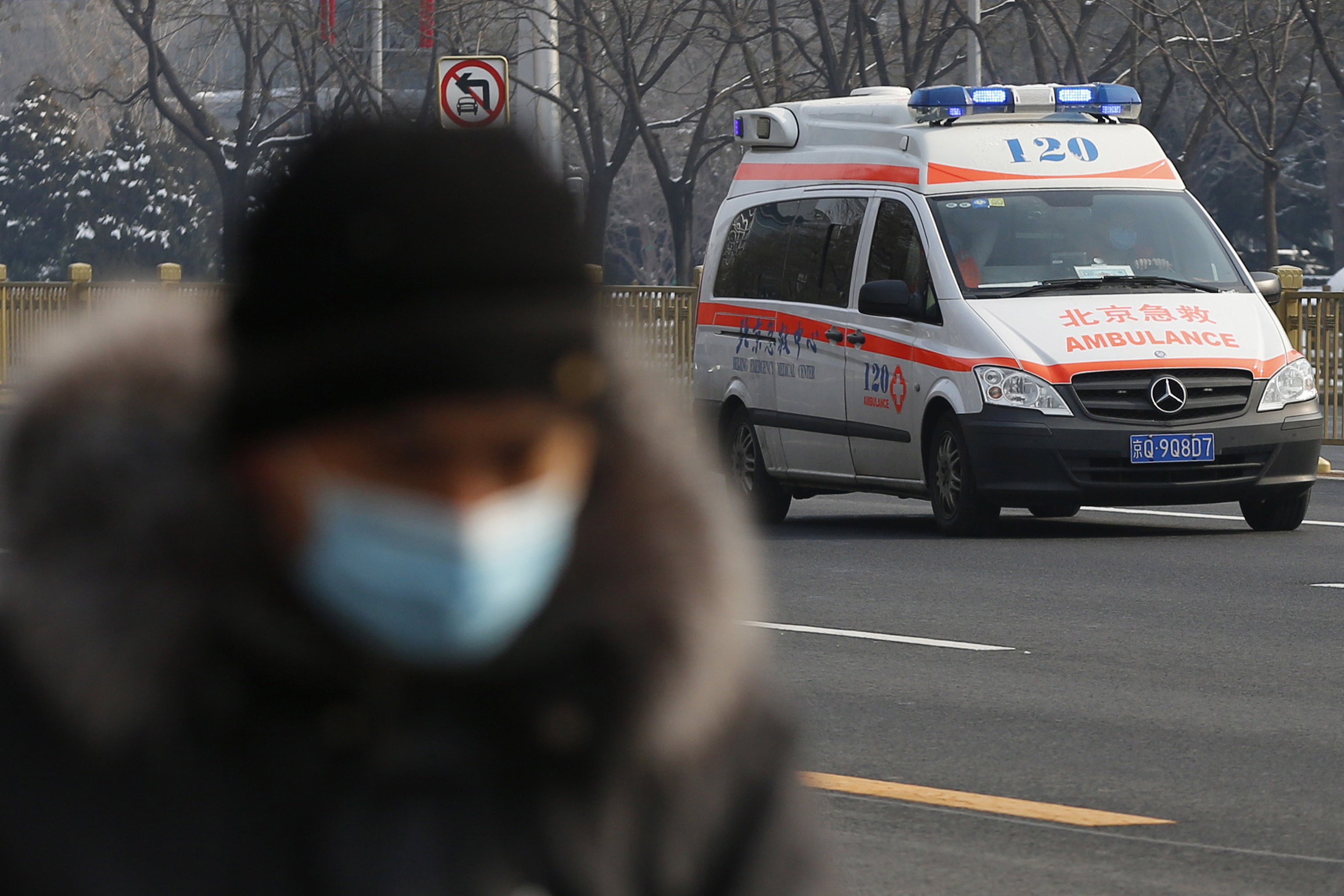A man wears a face mask as an ambulance drives by in Beijing on Feb 7, 2020.