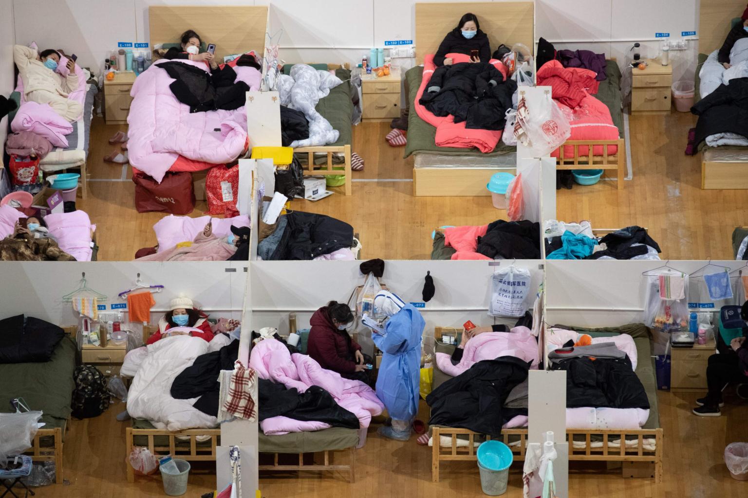 A photo taken on Feb 18, 2020, shows a medical worker checking on patients with mild symptoms of the coronavirus in the temporary Fangcai Hospital set up in a sports stadium in Wuhan.