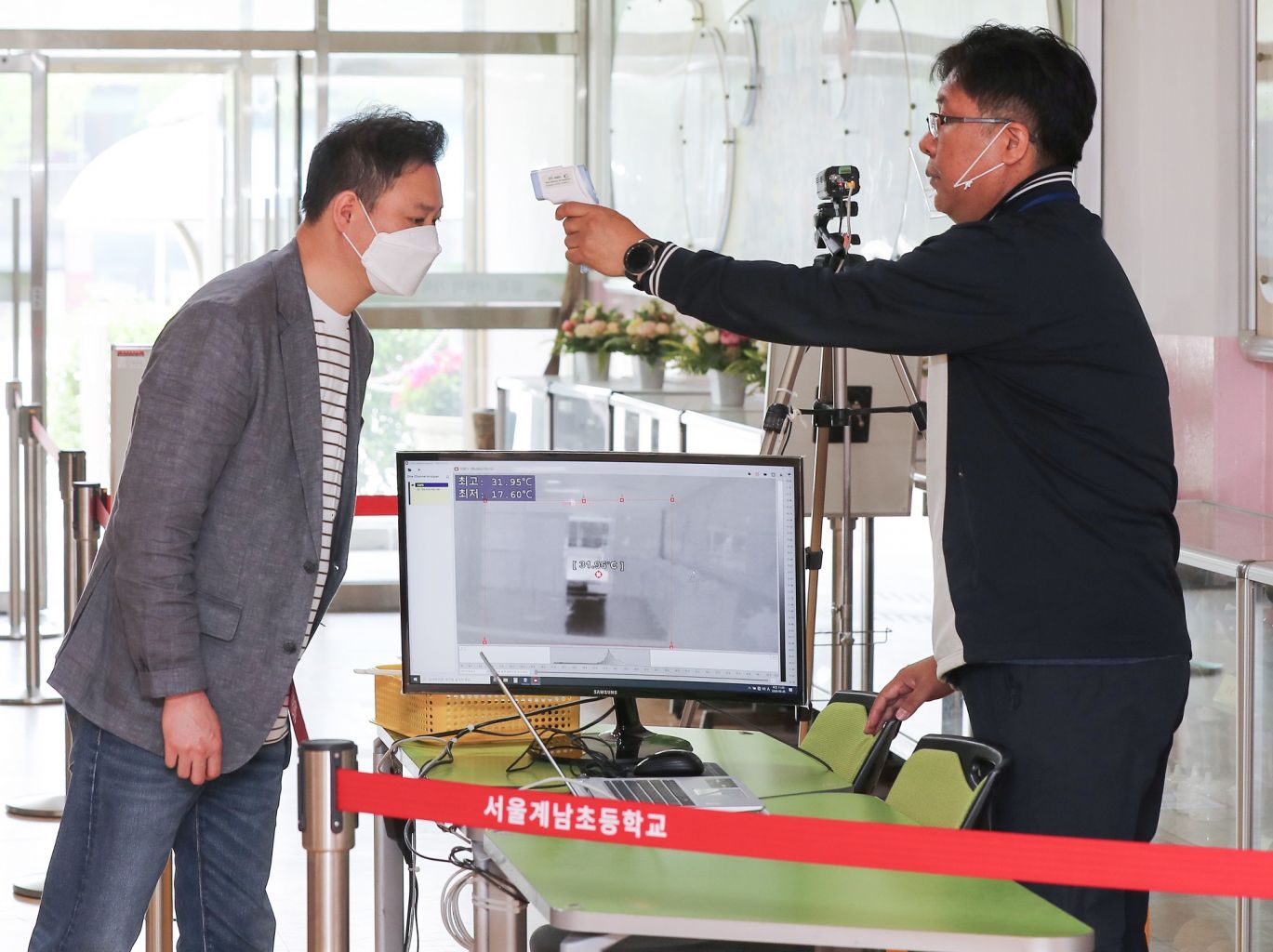 Teachers check a thermal scanner at Gyenam Elementary School in Seoul, South Korea, May 26, 2020.