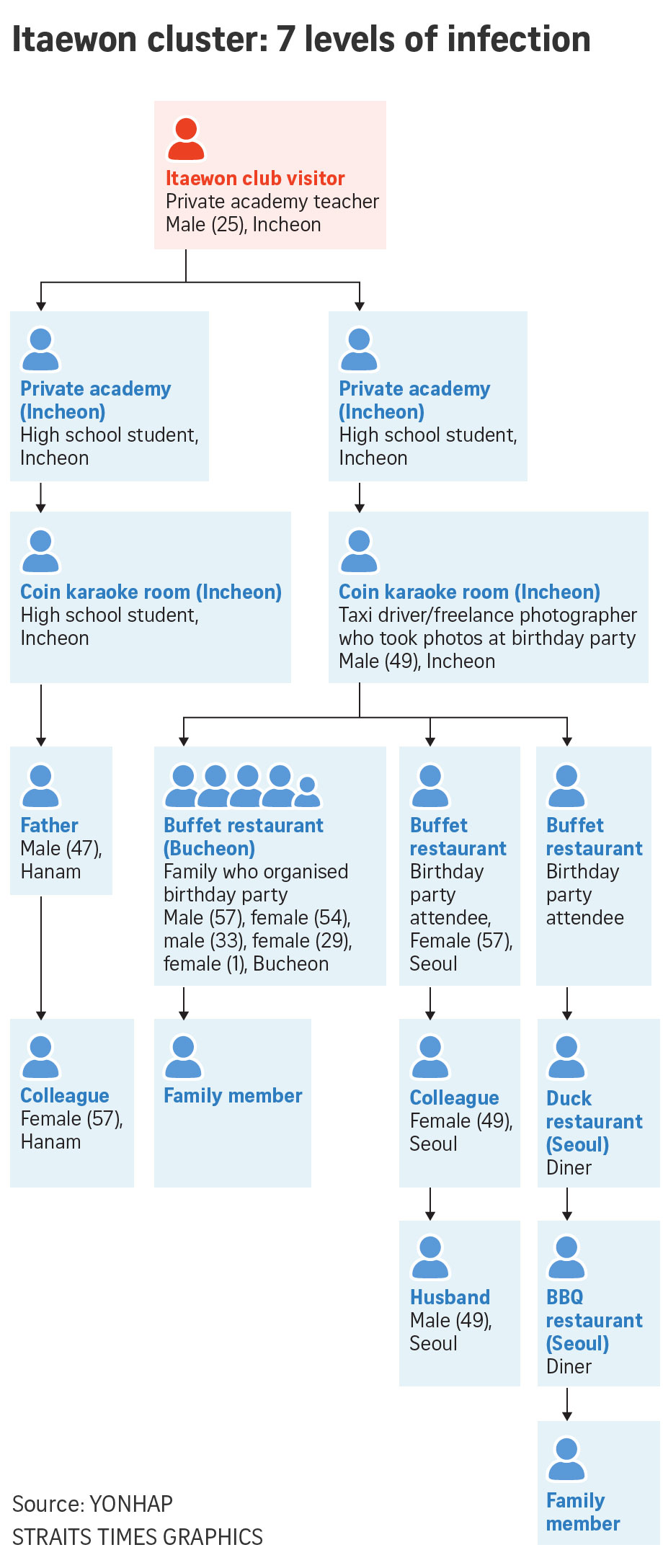 SEOUL - A chain of coronavirus infections traced to Seoul's clubbing district Itaewon has grown to seven levels, causing uneasiness among parents as over two million students go back to the classroom on Wednesday (May 27) in the second phase of school reopening.