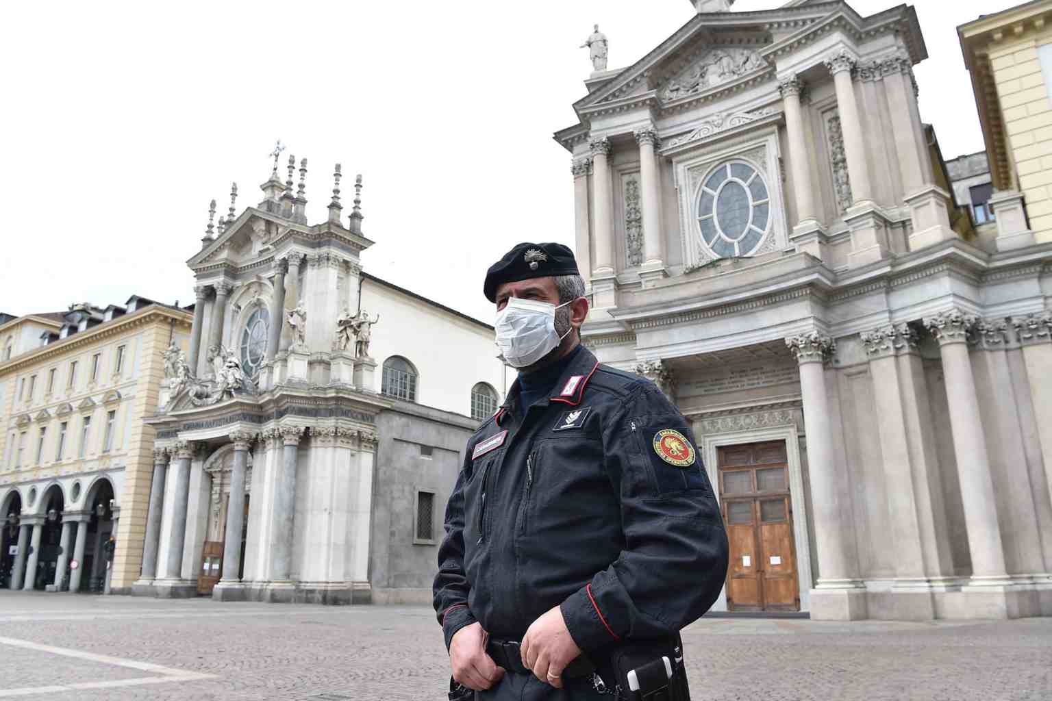 Italian authorities are seen in the streets of Turin, Italy, on March 25, 2020, during the coronavirus emergency lockdown.