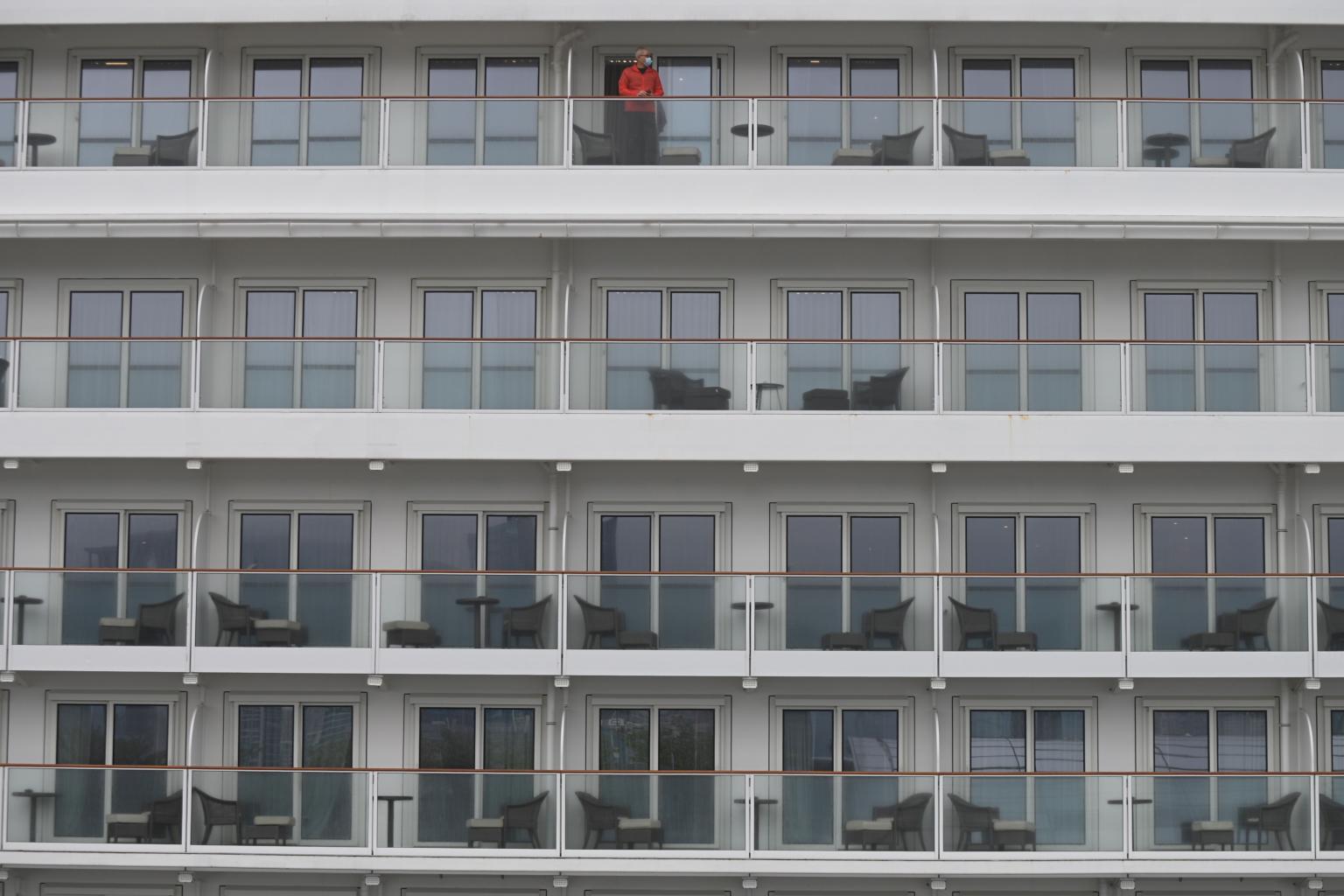 A passenger wearing a face mask looks out from a cabin of the World Dream cruise ship in Kai Tak cruise terminal in Hong Kong, on Feb 5, 2020.