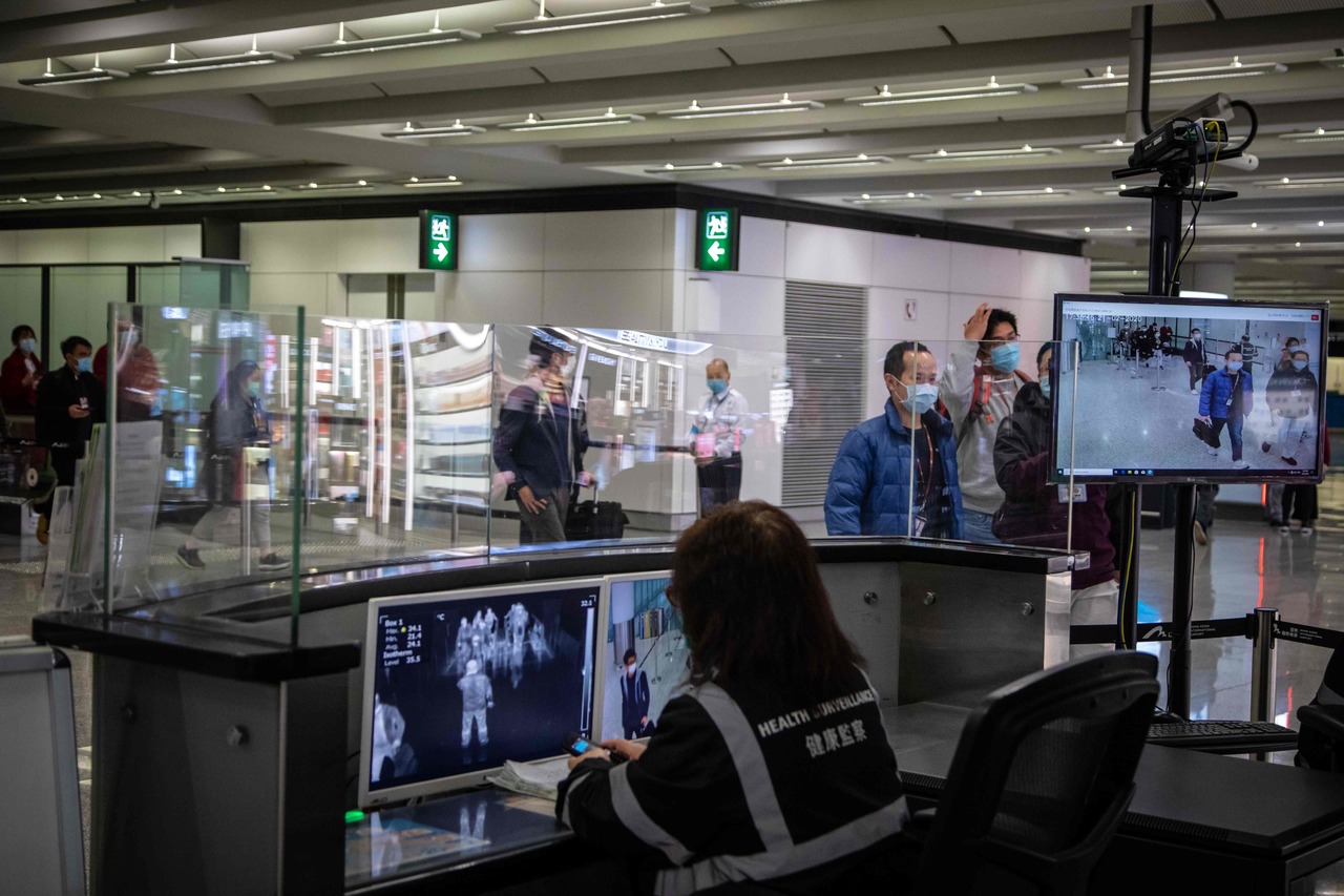 In a photo from Feb 21, 2020, airport health staff monitor the body temperatures of arriving passengers with thermal scanners in an arrival hall inside Hong Kong International Airport.