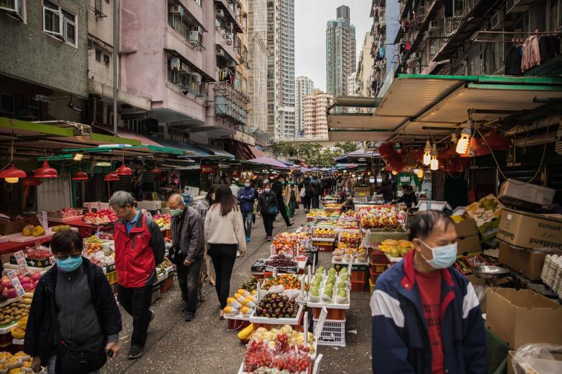 People wearing protective face masks shop at a fresh food market in Hong Kong on Feb 9, 2020.