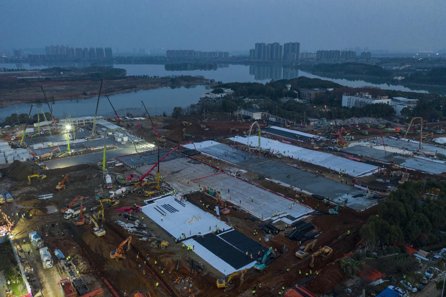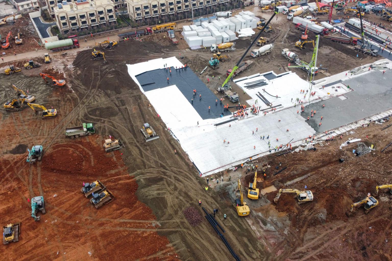 At the construction site of the Huoshenshan Hospital, a makeshift hospital for treating patients of the new coronavirus in Wuhan on Jan 30, 2020. Prefabricated units were used to build the hospital.