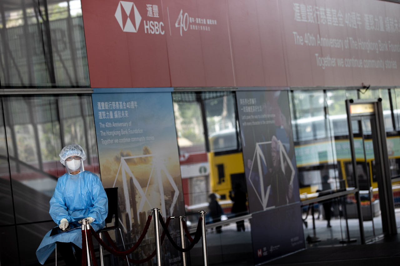 A security guard in protective gear stands by an entrance to the HSBC main building in Hong Kong, on March 17, 2021.