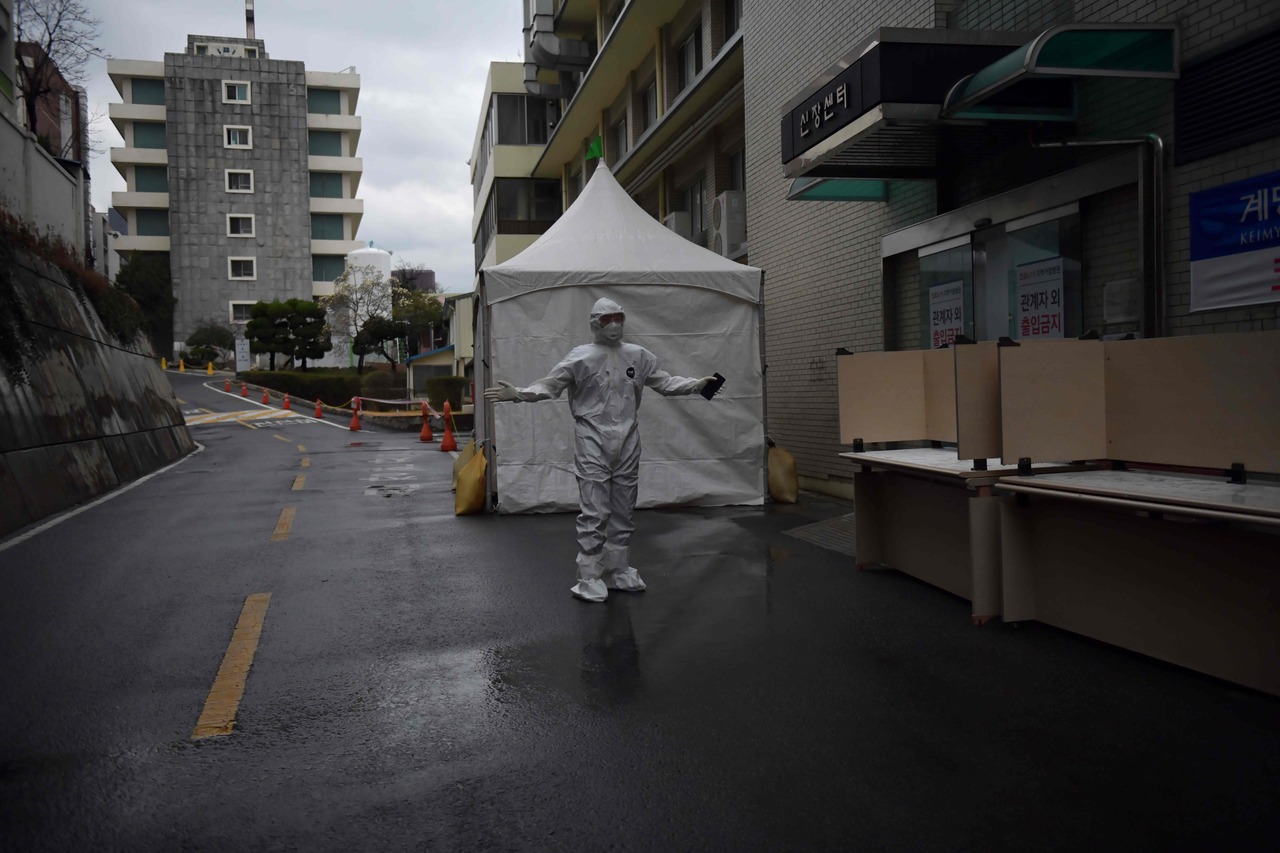 A hospital worker wearing protective equipment waits for patients to be brought to hospital in Daegu on March 10, 2020.