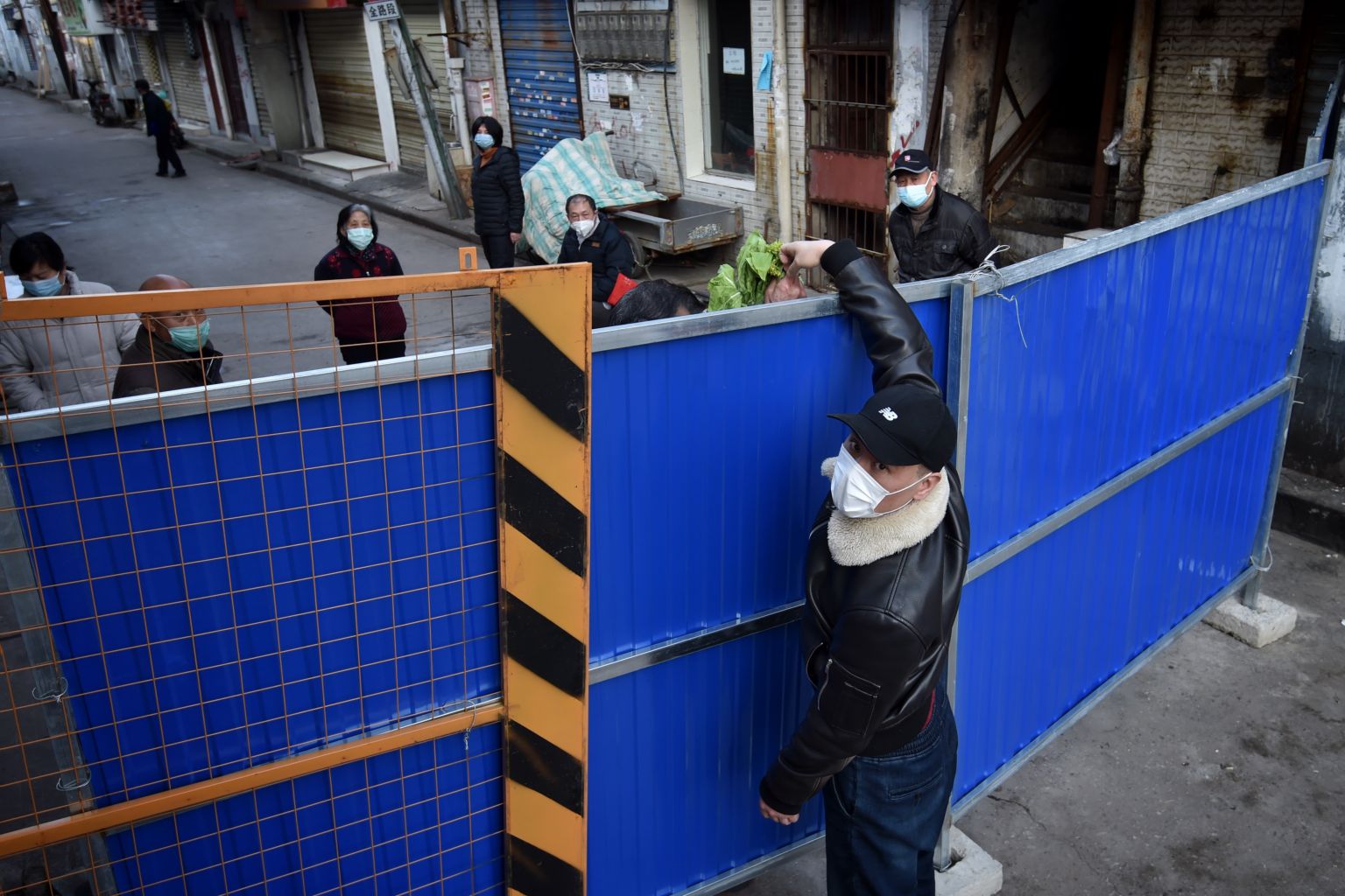 A masked man passes groceries over a temporary wall around a residential block in Wuhan, China, on Feb 23, 2020.
