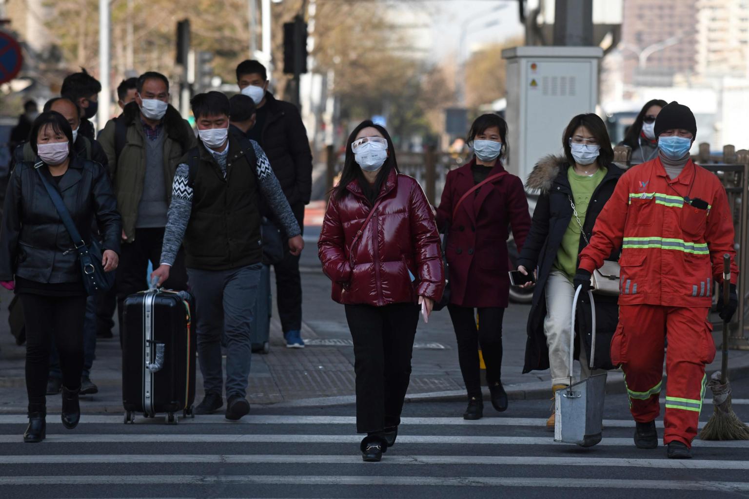 People wear face masks as a preventive measure against the coronavirus as they cross a road in Beijing, on March 11, 2020.