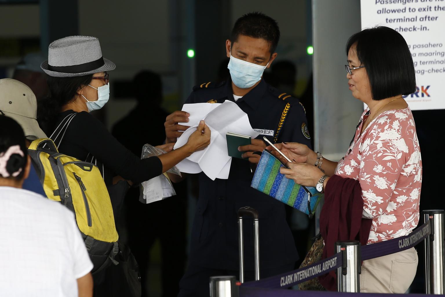 A security officer checks documents of travellers at the Clark International Airport in Mabalacat, Pampanga province, in Philippines, on Feb 8, 2020.