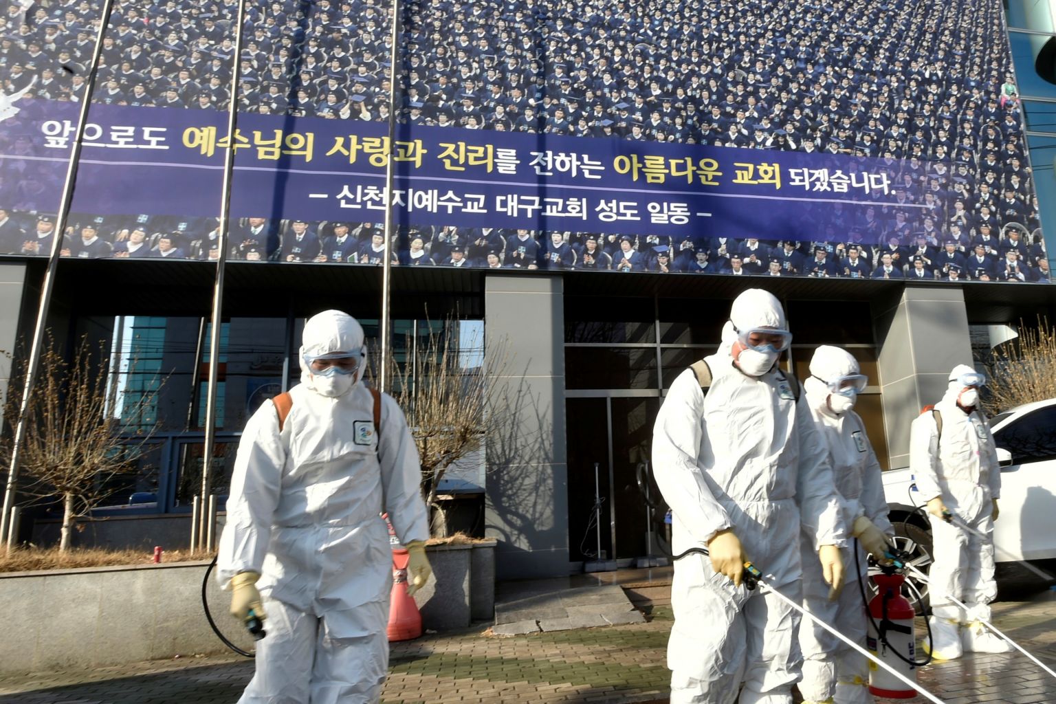 Workers sanitise a street in front of a branch of the Shincheonji Church of Jesus in Daegu, South Korea, on Feb 19, 2020.