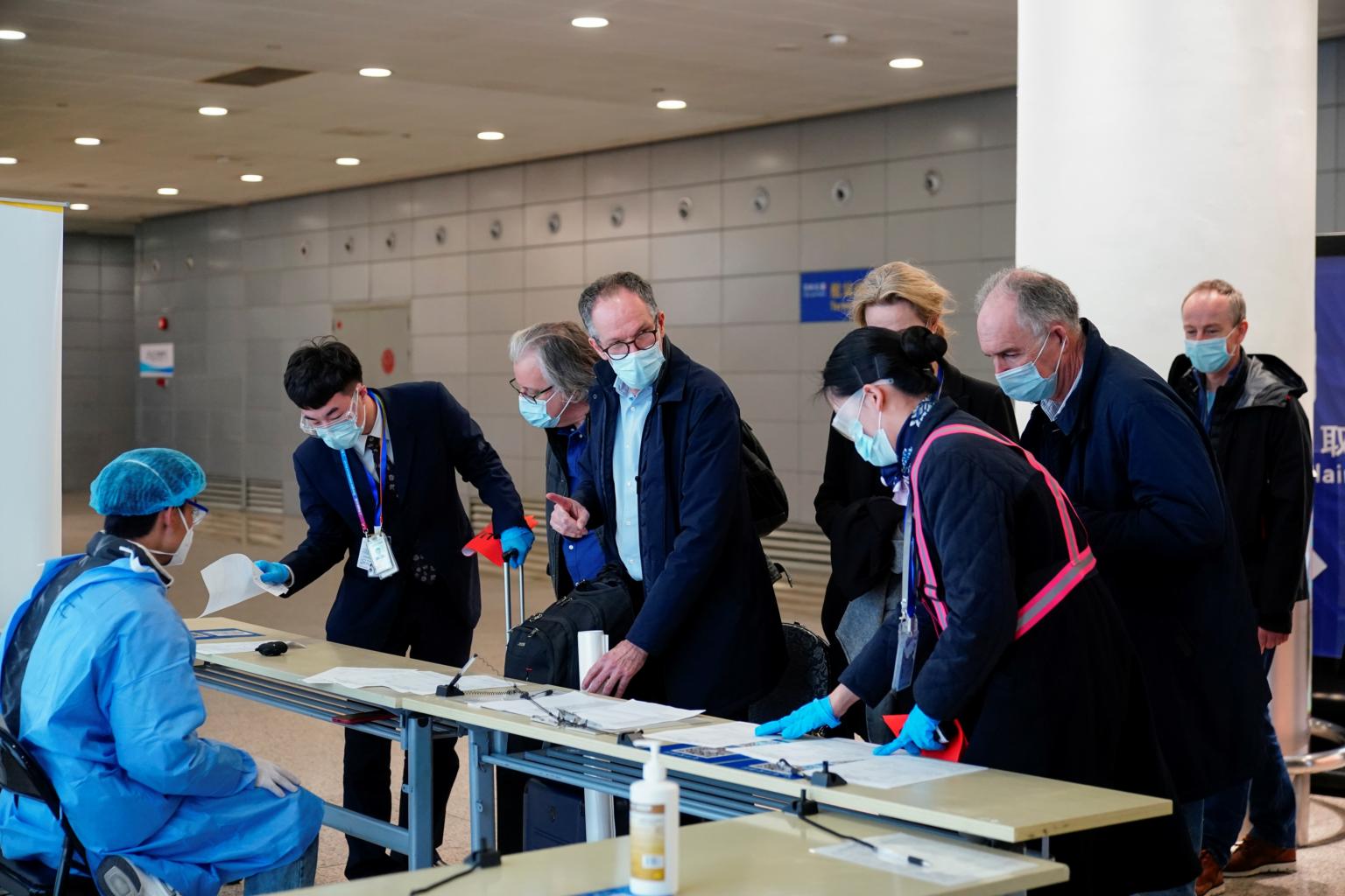 Dr Peter Ben Embarek, and other members of the WHO team arrive at the Pudong International Airport in Shanghai, China, on Feb 10, 2021.