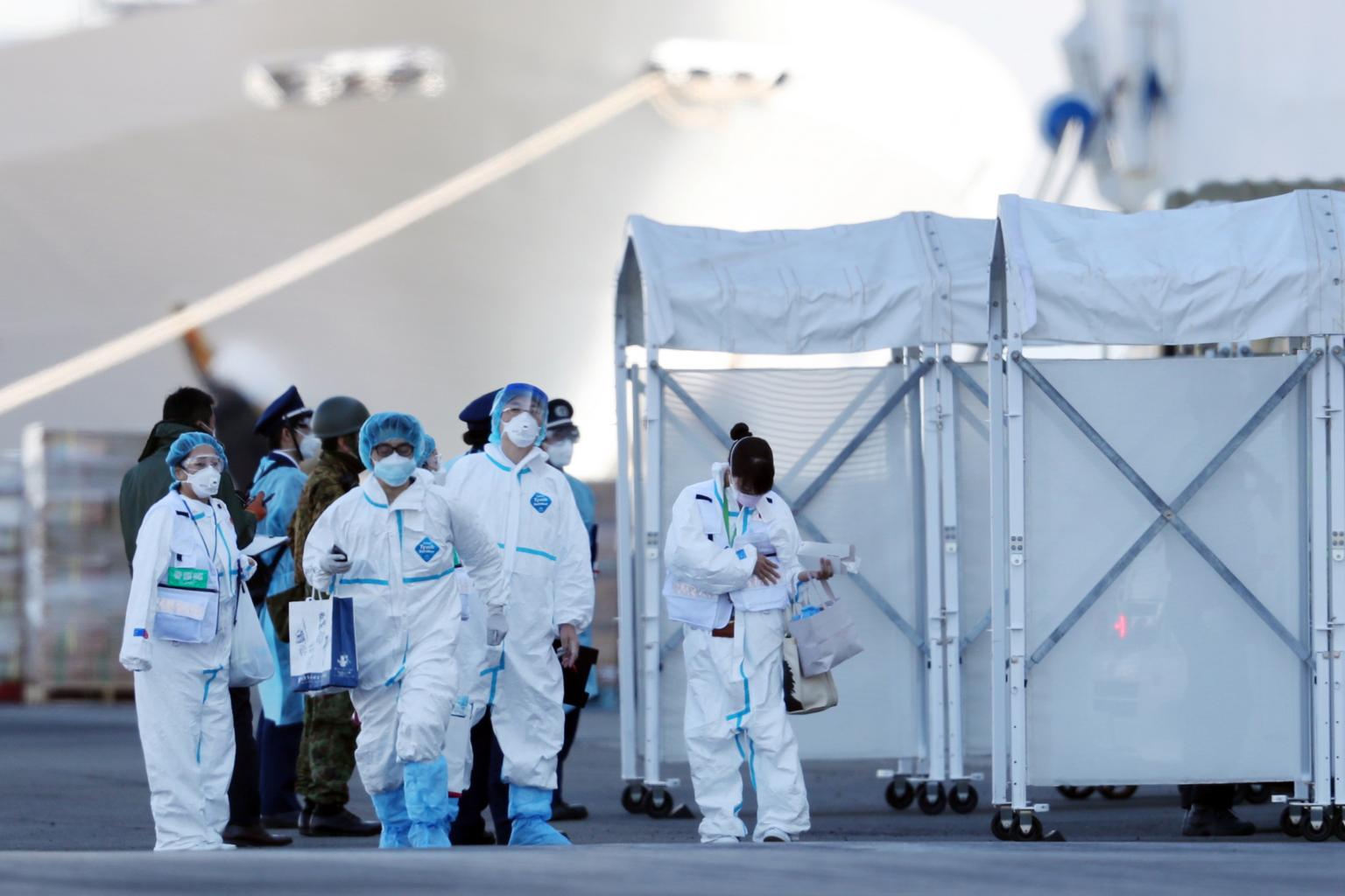 Staff members wearing protective gear prepare to enter the Diamond Princess cruise ship docked at the Daikoku Pier Cruise Terminal in Yokohama, on Feb 10, 2020.