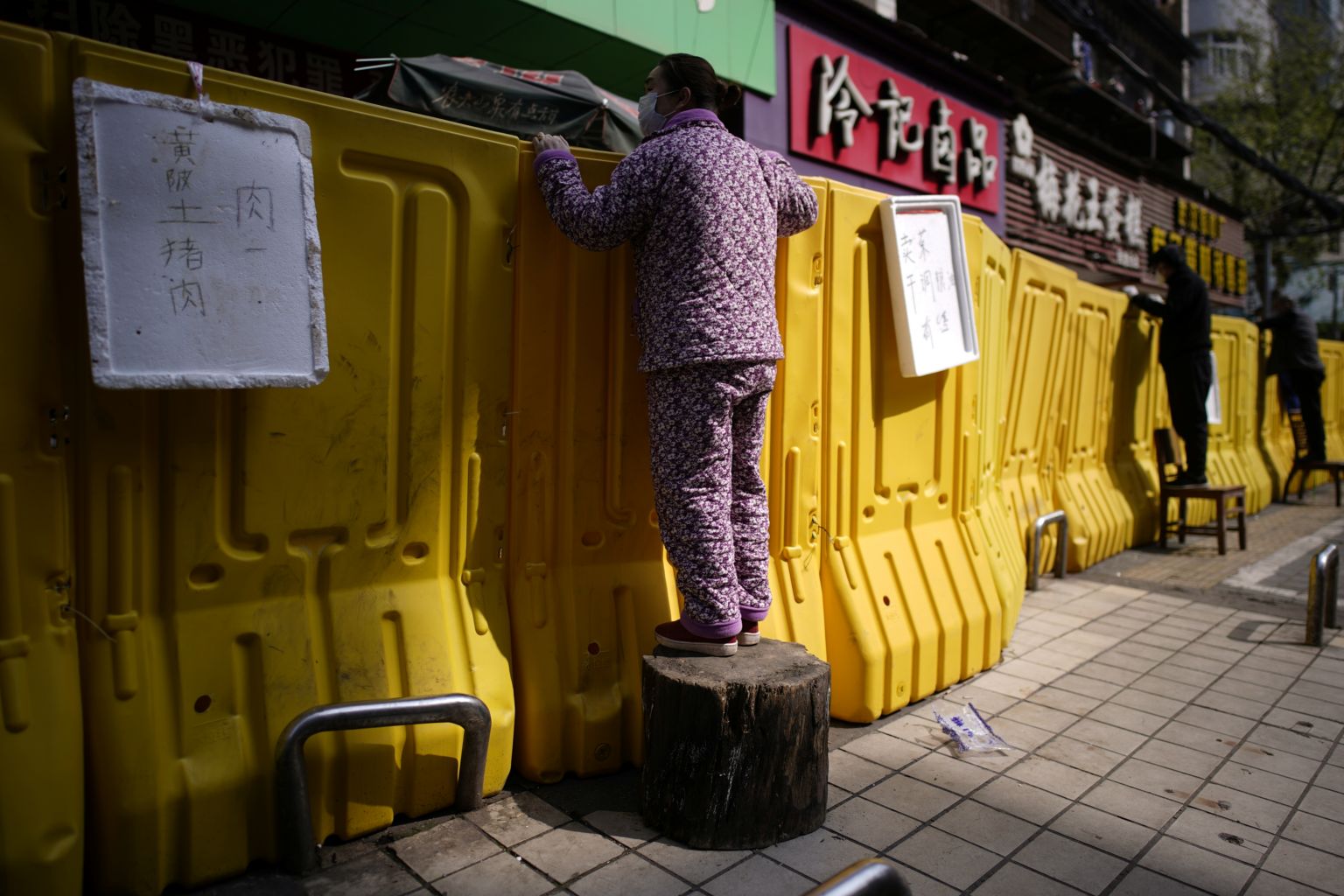 Residents pay for groceries by standing on chairs to peer over barriers in Wuhan, Hubei province, on April 1, 2020.