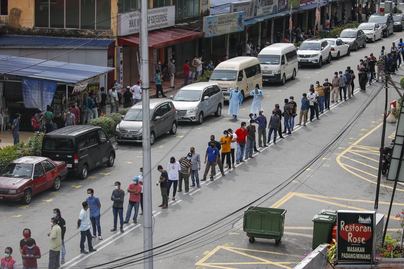Residents around Raja Bot market at Kampong Bharu line up to register for Covid-19 screenings in Kuala Lumpur, Malaysia, on May 7, 2020.