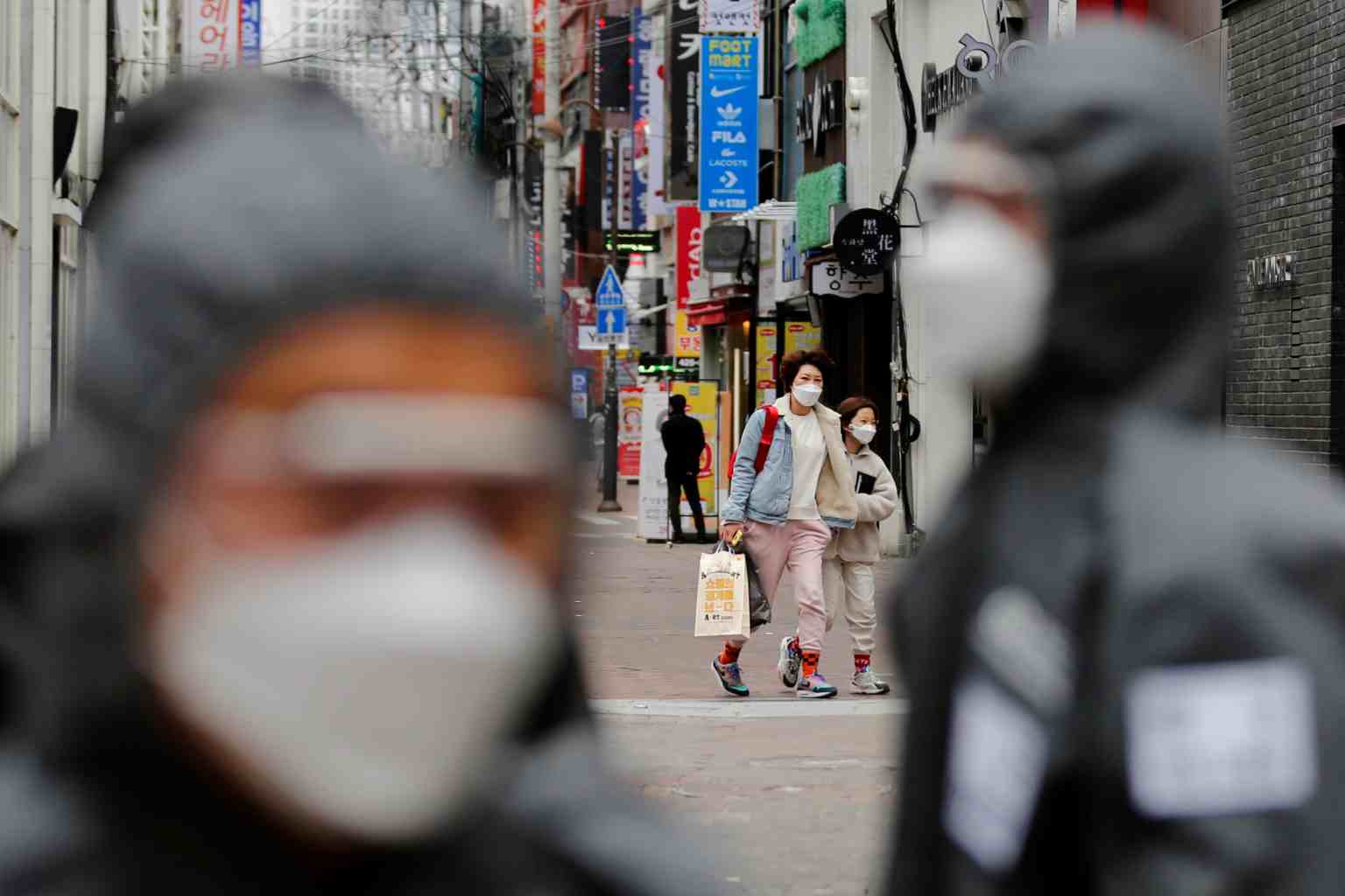 Pedestrians wearing masks are seen behind South Korean soldiers doing quarantine works in Daegu, South Korea, on March 15, 2020.