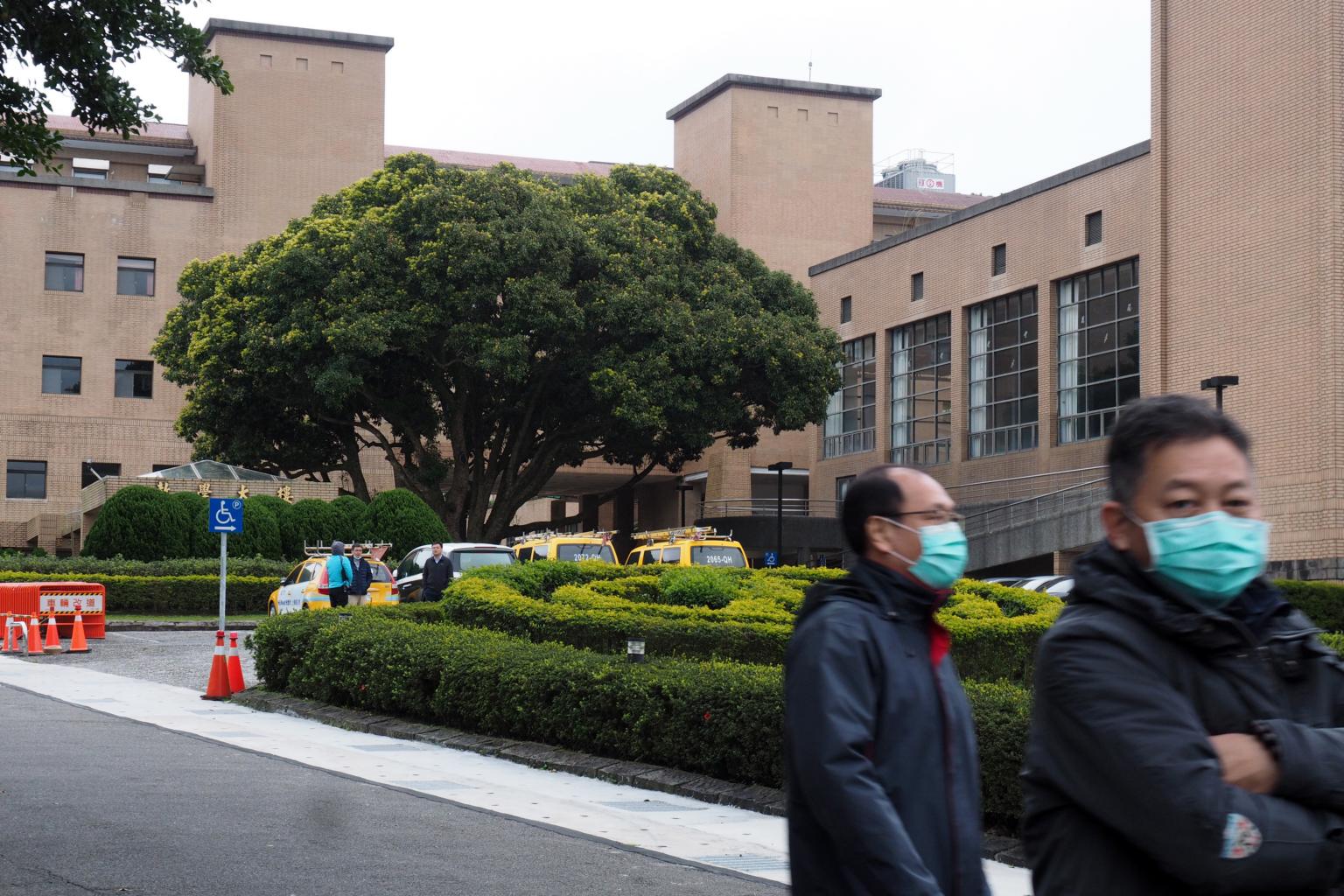 Two men walking past a building which will reportedly serve as a quarantine center for Taiwanese citizens evacuated from Wuhan; in Taipei, on Feb 3, 2020.