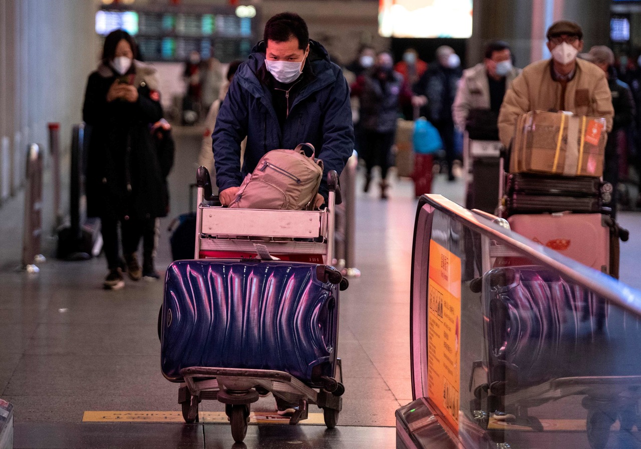A passenger wearing a protective face mask pushes a trolley as he arrives at the Beijing Capital International Airport on Feb 2, 2020.