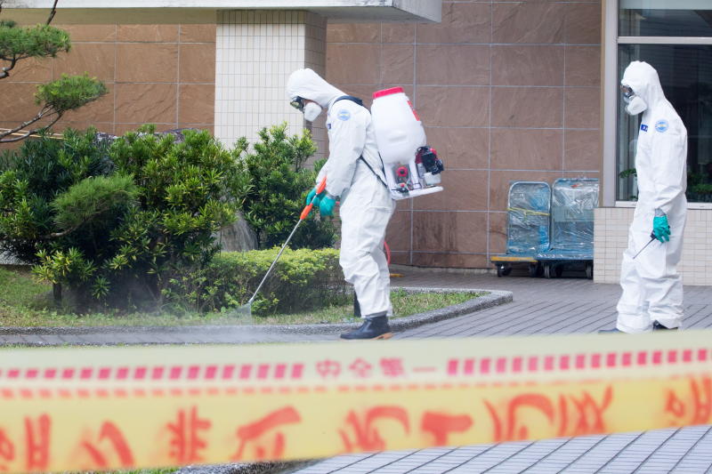 Taiwanese military from the 33rd Chemical Group 6th Army Corps personnel sanitizing the Wuhan evacuees quarantine facility, at an undisclosed location in Taiwan, on Feb 19, 2020.