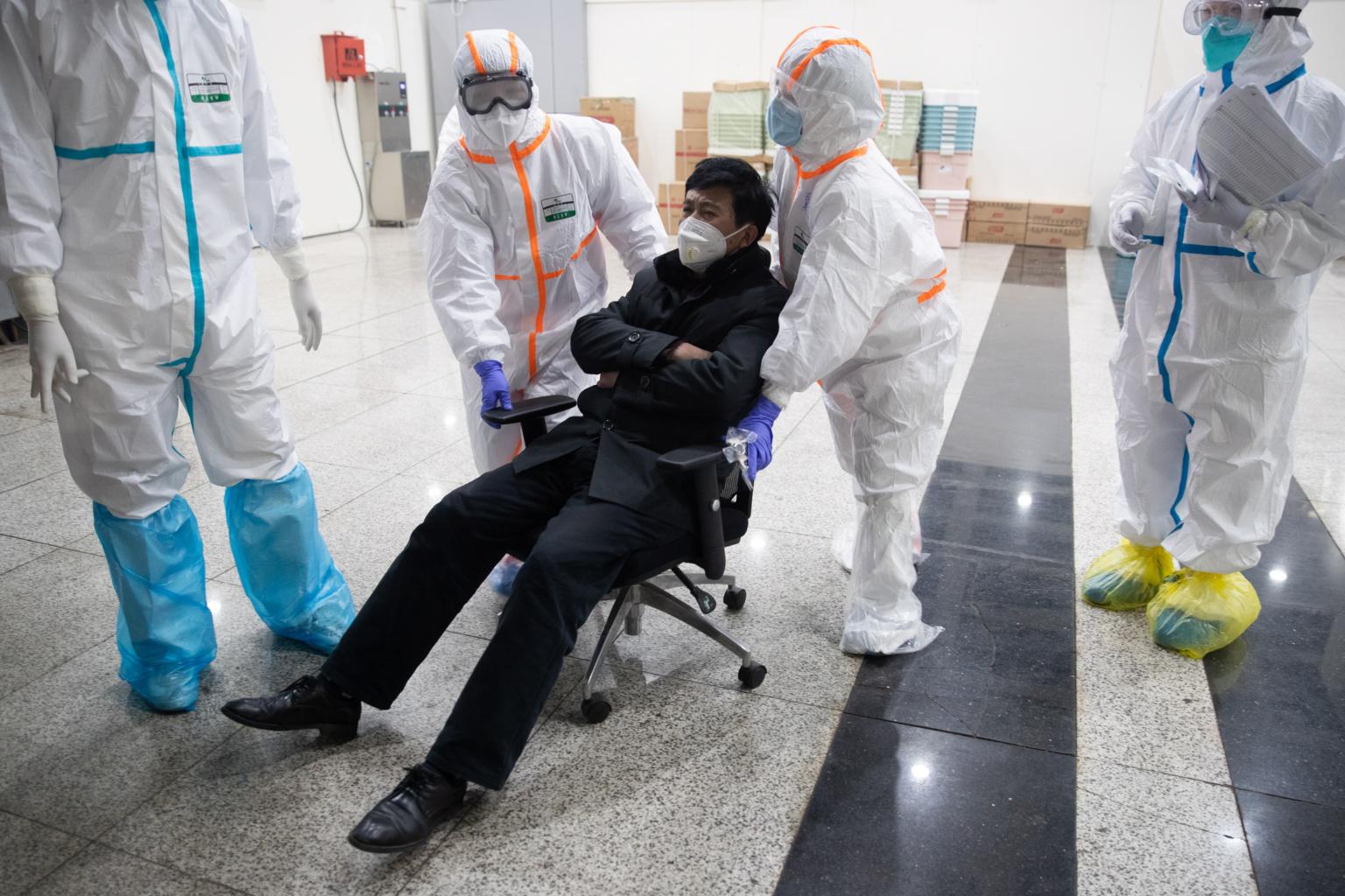 A patient infected by the coronavirus is received at a makeshift hospital at Wuhan International Convention and Exhibition Centre in Wuhan on Feb 5, 2020.