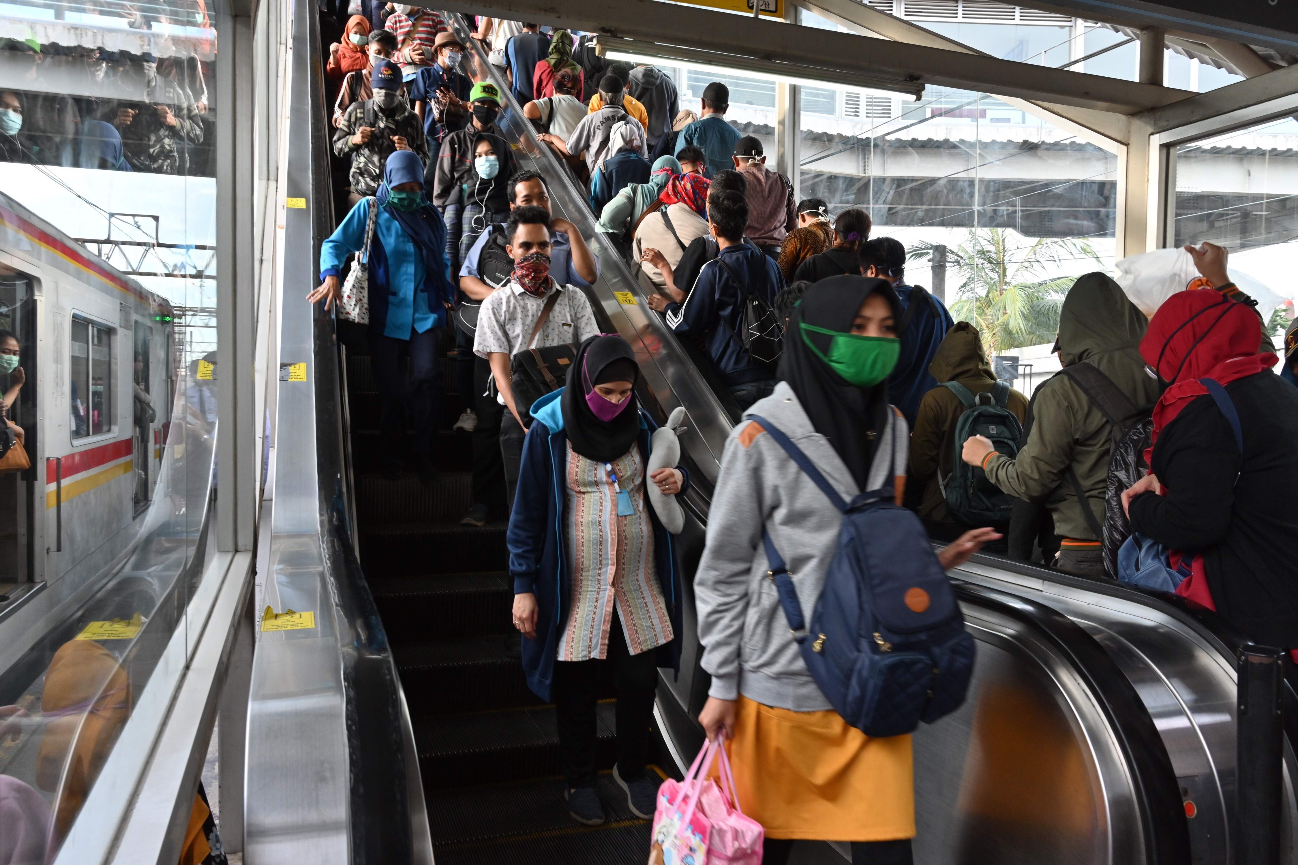 Commuters wearing face masks at Tanah Abang train station in Jakarta on April 7, 2020.