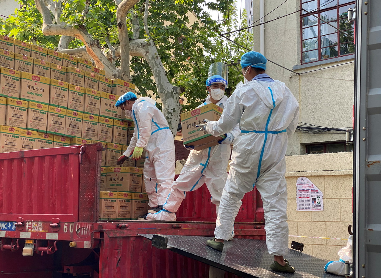 Workers unload boxes of soy sauce amid a lockdown in Shanghai on April 21, 2022.