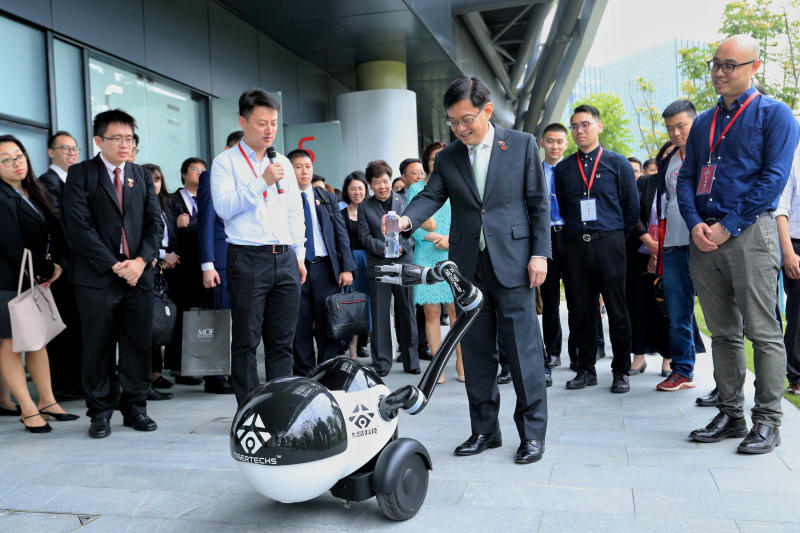 Deputy Prime Minister Heng Swee Keat interacting with a robot while touring artificial intelligence hub Zhangjiang International Innovation Harbour in Shanghai on May 25, 2019.