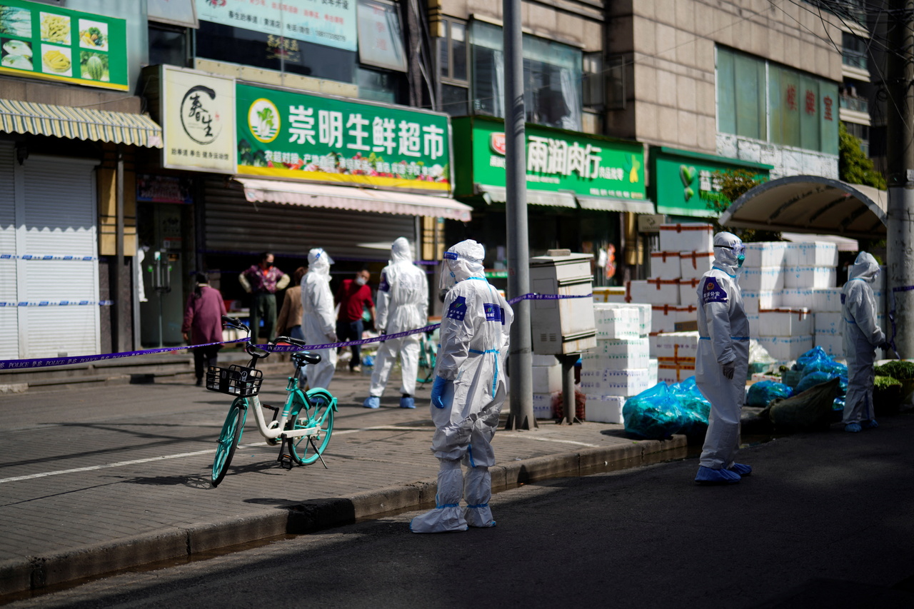 Police and security personnel stand outside food stores following the Covid-19 outbreak in Shanghai on March 29, 2022.