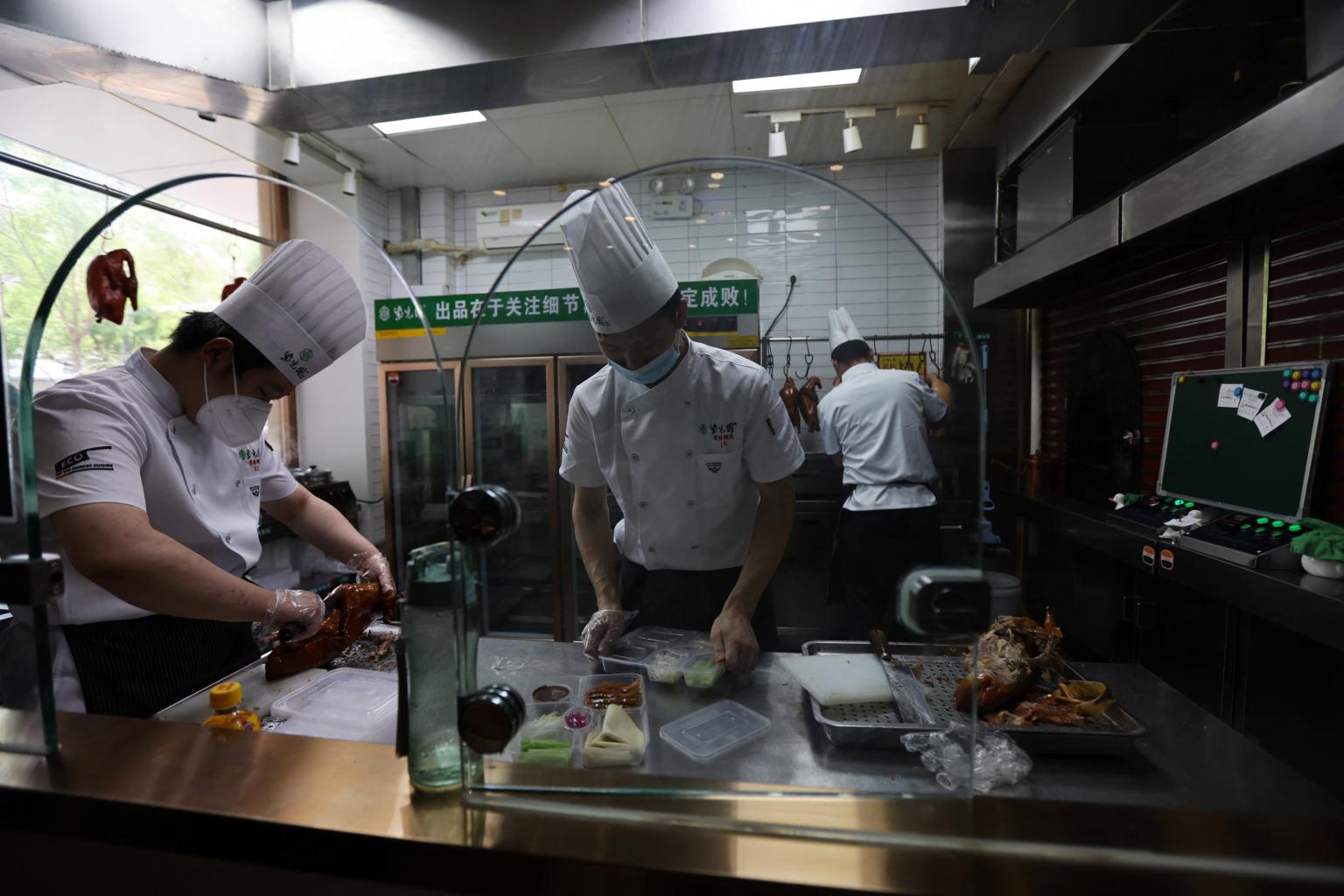 Restaurant workers preparing roast duck for takeaway orders in Beijing on May 17, 2022.