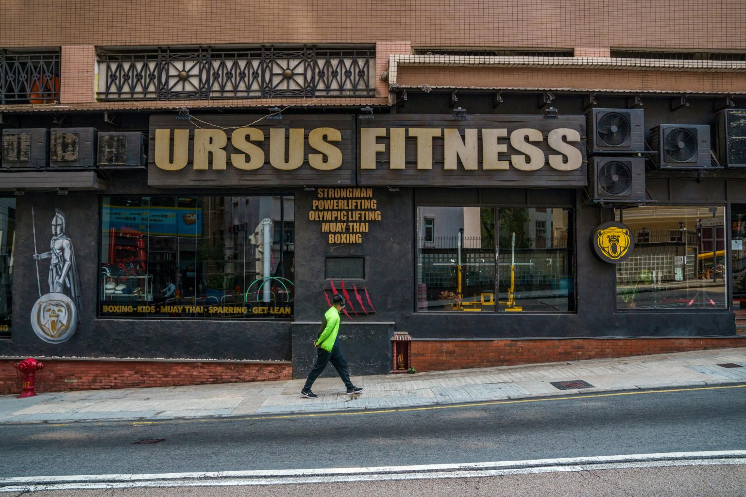 A pedestrian walks past the closed Ursus Fitness centre in Hong Kong on March 12, 2021.