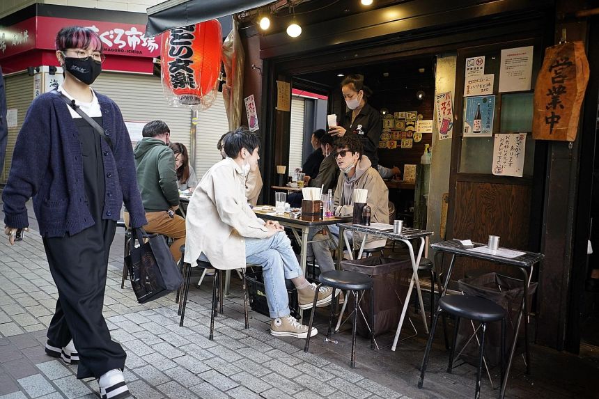 Diners at a restaurant at Ueno district in Tokyo on April 12, 2021.