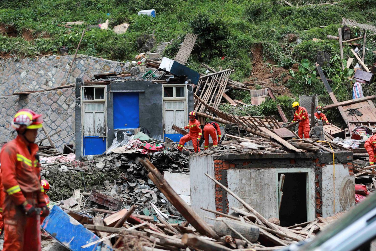 Firefighters search for survivors in collapsed houses damaged by a landslide after Typhoon Lekima hit Shanzao village in Wenzhou, Zhejiang, on Aug 11, 2019.