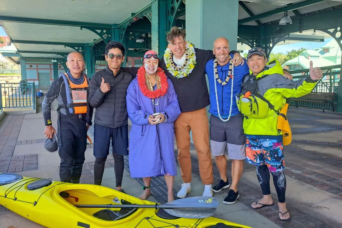 Mr Simon Holliday (third from right), Ms Edie Hu (third from left) and Mr Brett Kruse (second from right) at the Disneyland Resort Pier after they successfully circumnavigated Lantau.
