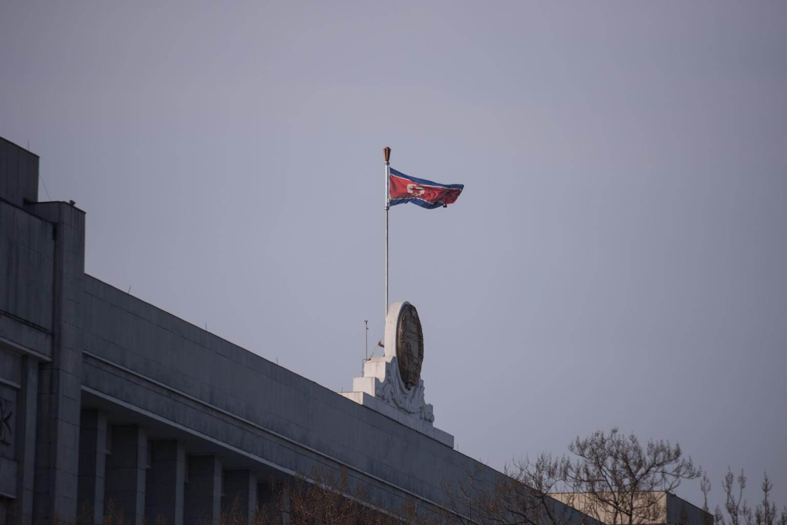 A North Korean flag flies above the Supreme People's Assembly in Pyongyang, on March 9, 2019.