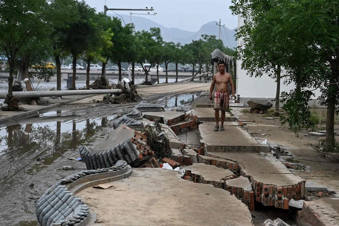 A resident walking on a broken wall in the aftermath of flooding at a village following heavy rain in Beijing on Aug 3.