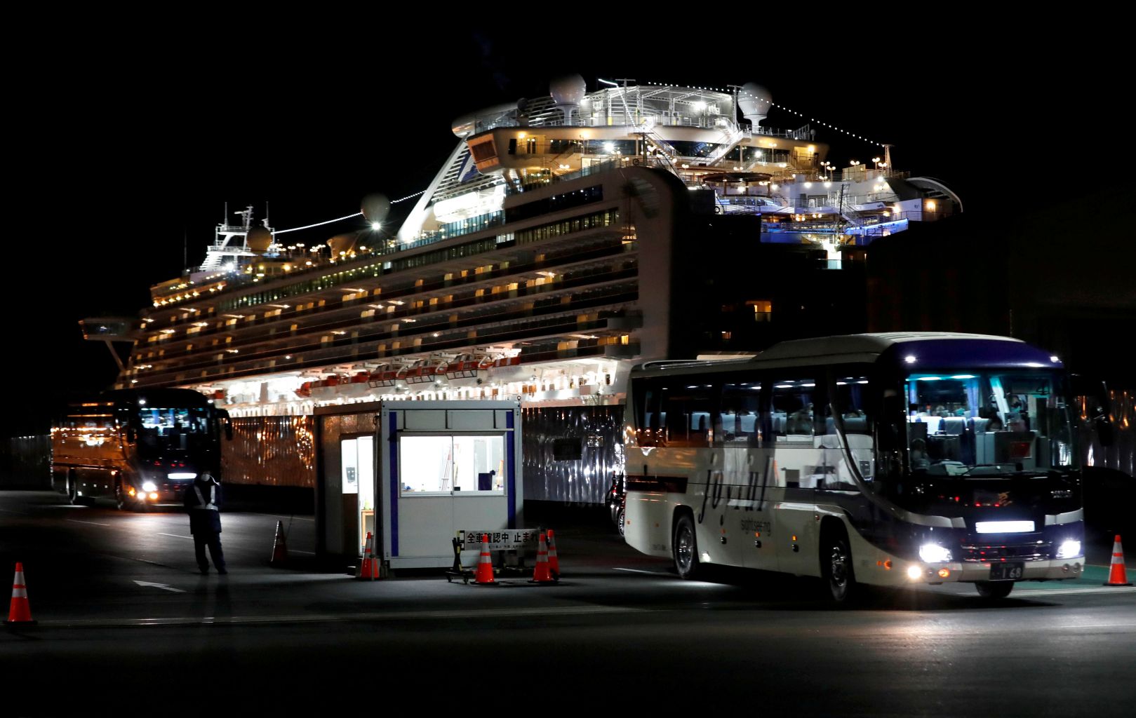 A bus transporting Hong Kong passengers from the Diamond Princess leaves the Daikoku Pier Cruise Terminal in Yokohama, Japan.