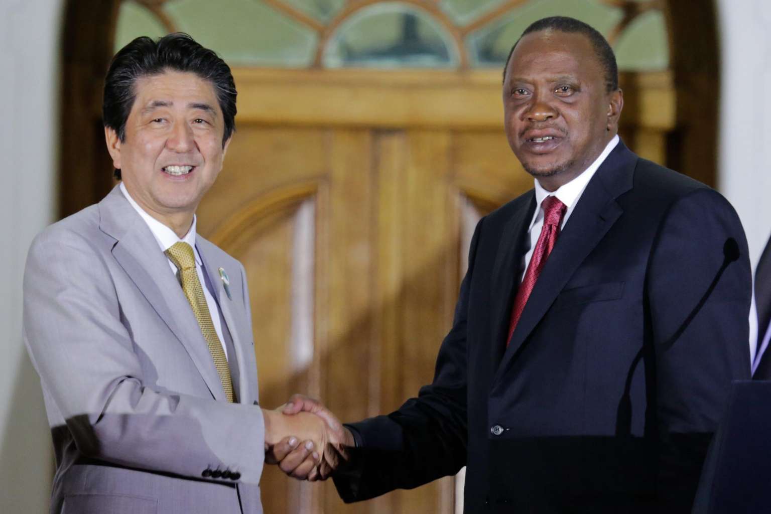 Japanese Prime Minister Shinzo Abe (left) shakes hands with Kenyan President Uhuru Kenyatta during a joint news conference at the State House in Nairobi, Kenya on Aug 28, 2016.