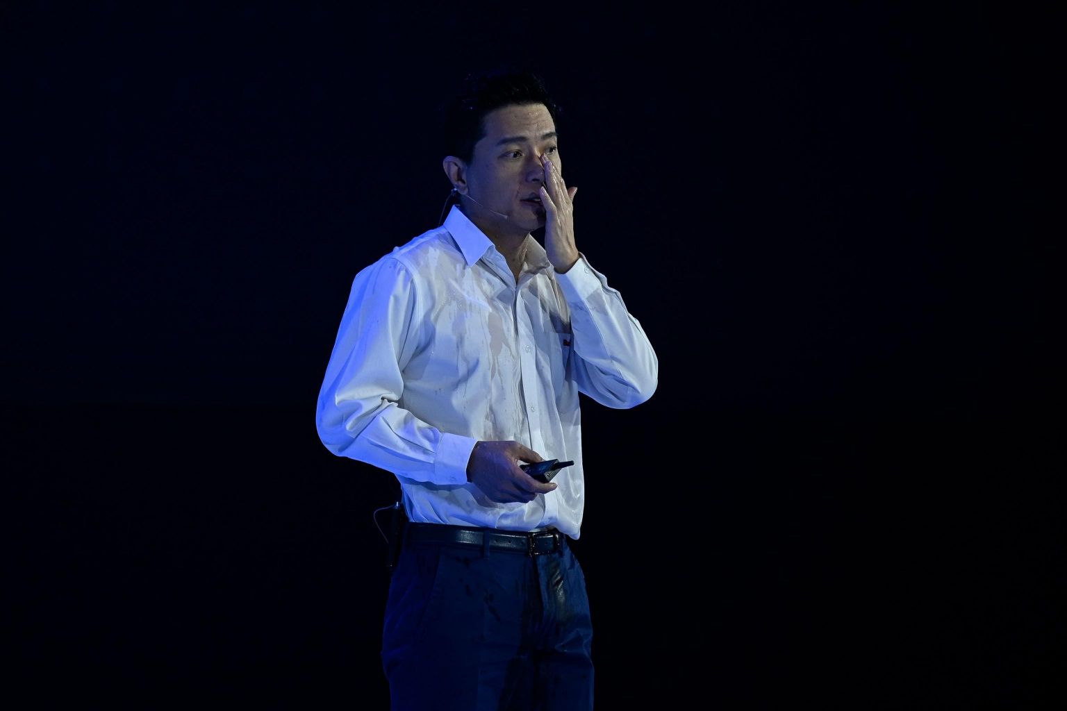 Baidu co-founder and CEO Robin Li reacts after a young man approached him, spilled liquid over his head and walked away during Baidu Create 2019 in Beijing, on July 3, 2019.