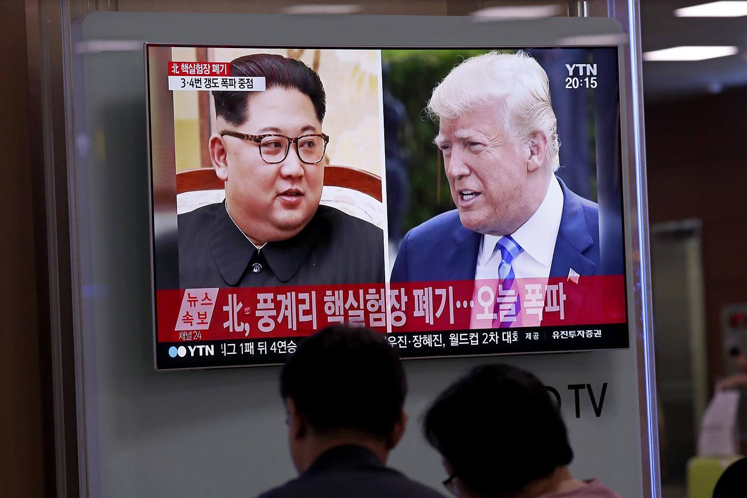 People watching a news broadcast showing US President Donald J. Trump (right) and North Korean leader Kim Jong Un, in Seoul, South Korea, on May 24, 2018.