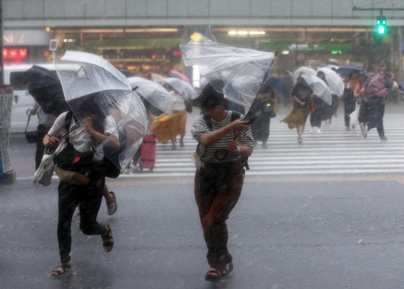 Pedestrians crossing a road struggle against the strong wind and rain in Tokyo, Japan, 28 July 2018, as Typhoon Jongdari is expected to make landfall in central Japan. Residents in flood-devastated western Japan have been warned to evacuate as soon as possible.