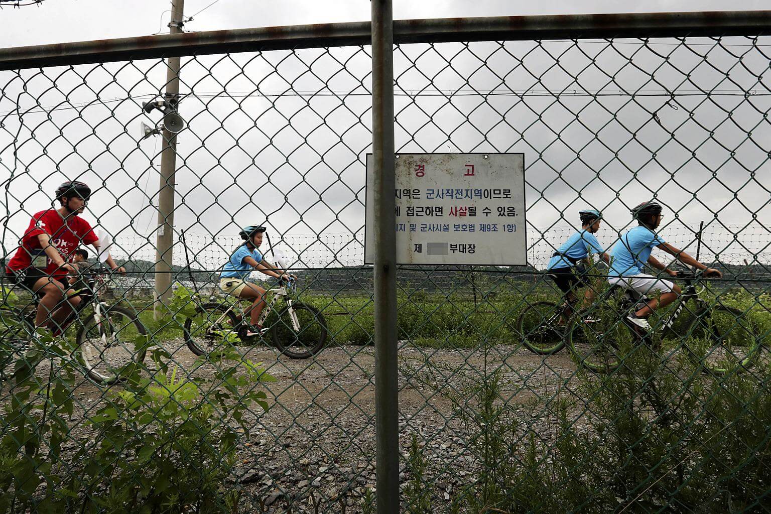 People ride bicycles on a road that runs along the Demilitarized Zone separating the two Koreas near the Imjingak Pavilion in Paju, north of Seoul, South Korea, on July 17, 2017.