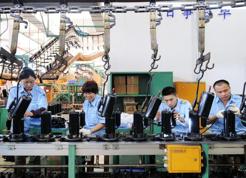 Employees working on a production line for domestic appliances at a factory in Jiujiang, Jiangxi province, on April 19, 2018.