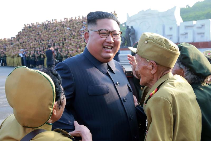 North Korean leader Kim Jong Un meets participants of the 5t National Conference of War Veterans in Pyongyang on July 27, 2018.